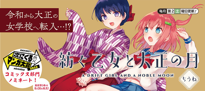 令和から大正の女学校へ転入…!? ある日地震で気を失ってしまい、目覚めた時には大正十年の銀座に倒れていた女子高生・紡。 行くあてもなく大ピンチなところを公爵令嬢・唯月に助けられ、彼女とともに女学校生活を送ることに。 遠く離れた時代に流れ着いた少女の未来はどうなってしまうのか…? きららキャラットで大人気連載中の大正タイムスリップストーリー!「紡ぐ乙女と大正の月」 第3巻は8月26日発売!