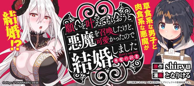 傭兵ギルドに属するテオ・アスペルは、弱すぎるゆえに、 色々なパーティに入ったり追い出されたりを繰り返していた。 強くなろうと思い、なんでも願いを叶えてくれるという悪魔を召喚することに成功。 その容姿を見た瞬間、『強くなる』願いは消し飛んでしまう……。 そして、久しぶりに召喚された悪魔はこう告げる。 「願いを叶えてやろう、しかしその代わりにお前の大事なものを――」 「僕と、け、結婚してください!」と答えるテオ。 「……はっ?」と戸惑う悪魔だが、その願いを叶え、二人は夫婦になるのだった……。 ――これは草食系な男子と、肉食系な悪魔が結婚し、 周りを騒ぎ立てながらも幸せに暮らしていくちょっとエッチな(?)物語。