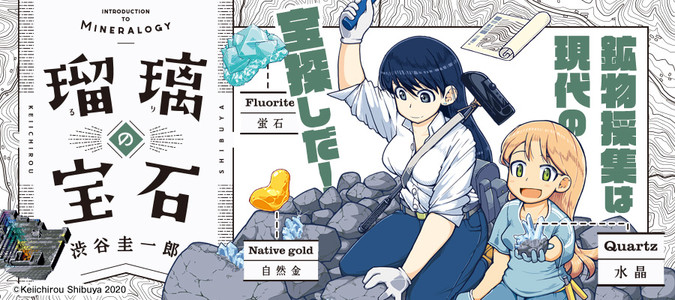 鉱物採集は現代の宝探しだ!宝石やアクセサリーが好きな女子高生ルリが、山へ川へ洞窟へ、鉱物採集の世界に飛び込んでいく。第1巻では、水晶、ガーネット、黄鉄鉱、砂金、蛍石など多数の鉱物が登場します。パニング皿、ハンマー、地形図など、専門的なツールを用いた採集シーンも魅力満載。鉱物学を修めた作者の確かな知見に基づく、本格サイエンスアドベンチャー!