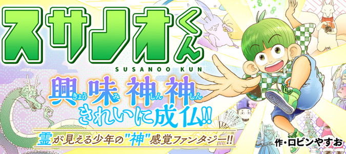 スサノオくんはどこにでもいる元気な男の子! ただ彼には…霊や神仏が「視えて」しまうのだ。スサノオくんの周りで次々と巻き起こる、 この世のものではない事件…それらをスサノオくんは仲間と一緒にどんどん解決!! “興味神神きれいに成仏!!” 古都・京都を舞台に、現代の日本に疲れたすべての大人に送る どこか懐かしいけど新しい“神”感覚ファンタジー、ここに開演!