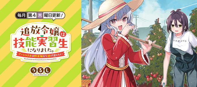 コミックス第①巻、2025年1月27日発売!! 野菜嫌いなワガママ令嬢のアーシャは、王子の婚約者を毒殺しようとした疑いで異世界に追放されてしまいました! 日本の野菜畑に落とされたアーシャは農家の少女・そだちに拾われて技能実習生として大嫌いな野菜を育てることに──!? 社会的労働コメディー、開幕です♪