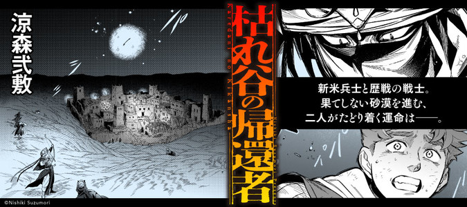 『ウツツエスケープ』の涼森弐敷が描く新作読切。砂漠の戦場で武功を目論む新米兵士・ルベルと、敵対する武装勢力の一人の戦士。広大な砂漠地帯で紡がれる、二人の数奇な運命は……。