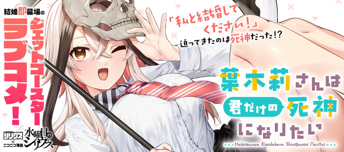 単行本1巻発売中!!『葉木莉さんは君だけの死神になりたい』「私と結婚してください!」主人公の二上の前に突如現れた死神の葉木莉。結婚する気はないと断固拒否する二上に告げられた衝撃の“死因”はなんと「結婚死」だった?!恋愛に 一切興味のない二上と絶対に死なせたい死神の葉木莉。結婚=死、絶対に逃れられない死神ラブコメディ!