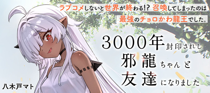ラブコメしないと世界が終わる!? 召喚してしまったのは、最強のチョロかわ龍王でした。 14歳の中二病、黒間勇人(くろまゆうと)がインスピレーションのままに落書きした魔法陣から喚びだされたのは、まさかの最強龍王で…(?) さらに勇人は、3000年間も封印されていたさみしがりの邪龍ちゃんと、わけあって友達になることに…!! 今、世界の命運が、さりげなく一人の少年に託される。